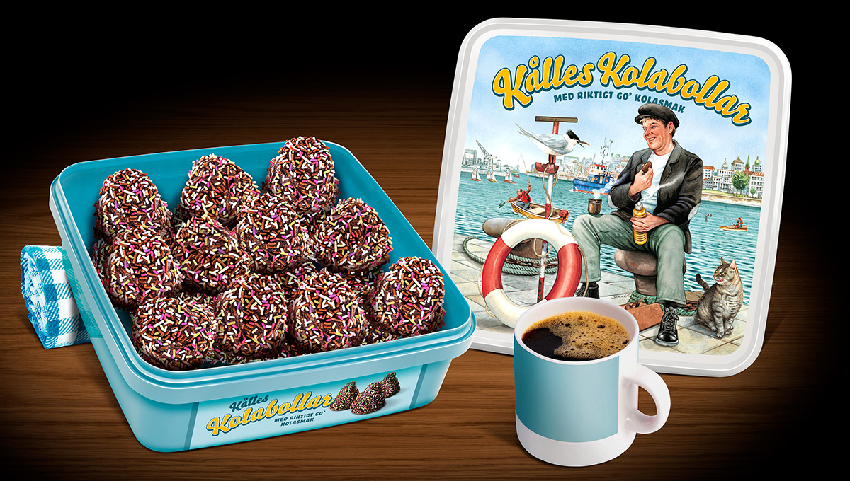 Kålles Kolabollar. Kondisbitar med kolabitar 4% och strössel 8%. Vikt 540 g. Ingredienser: Havregryn, socker, vegetabiliskt fett (certifierad segregerad palm, shea, raps, kokos, solros), glukossirap, invertsockerlösning, vatten, fettreducerat kakaopulver, stärkelse (potatis, majs), vetemjöl, äggpulver, salt, aromer, antioxidationsmedel (citronsyra), bakpulver (bikarbonat, difosfater, hjorthornssalt), emulgeringsmedel (mono- och diglycerider av vegetabiliska fettsyror, lecitin, sorbitantristearat), färgämne (sockerkulör – ammoniakprocessen), konserveringsmedel (kaliumsorbat), ytbehandlingsmedel (shellack, bivax). Kan innehålla spår av råg, mjölk, nötter och mandel. Bakat i Sverige.